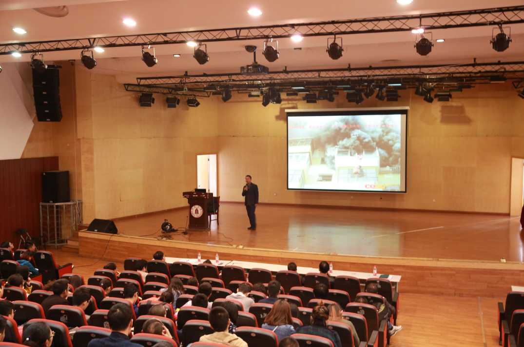 易义老师从近期发生的火灾说起,并谈及前段时间震惊全国的天津港爆炸事件中,令一百多名消防战士丧命的悲剧,以此作为引子开始介绍火灾发生的原因及火灾隐患。其中不乏平时我们都掉以轻心的问题,比如离开办公室后仍然开着电脑、开着饮水机,手机充完电后充电器继续插着,夜晚睡觉时从不会切断电视电源,跳闸了直接将闸重新推上去等等。易义的话提醒了在座的每一位老师和同学,提高了老师和同学们的消防安全意识。除了介绍火灾发生的原因、火灾隐患及如何防火以外,易义老师还图文并茂的解释各种灭火工具的优缺点、用法和需要注意的地方,并在现场演示了干粉灭火器的使用方法及注意事项。