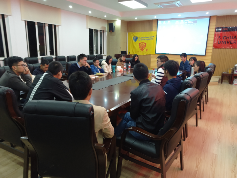 晚上七点整,学术交流沙龙正式开始。首先bat365在线体育登录副院长张启灿教授为新老会员介绍了行业动态和近期学术会议,鼓励大家积极参加学术会议以提高自身学术水平。紧接着光学工程学生协会会长吴周杰向研一新生介绍了社团发展历程、常规活动以及会员的权益与义务。随后,光学工程学生协会前会长黄人帅为大家带来2017 SPIE. OPTICS + PHOTONICS国际会议参会分享,为大家介绍了他在美国开会期间的见闻,同时为会员出国参加会议给出了多条实用建议。