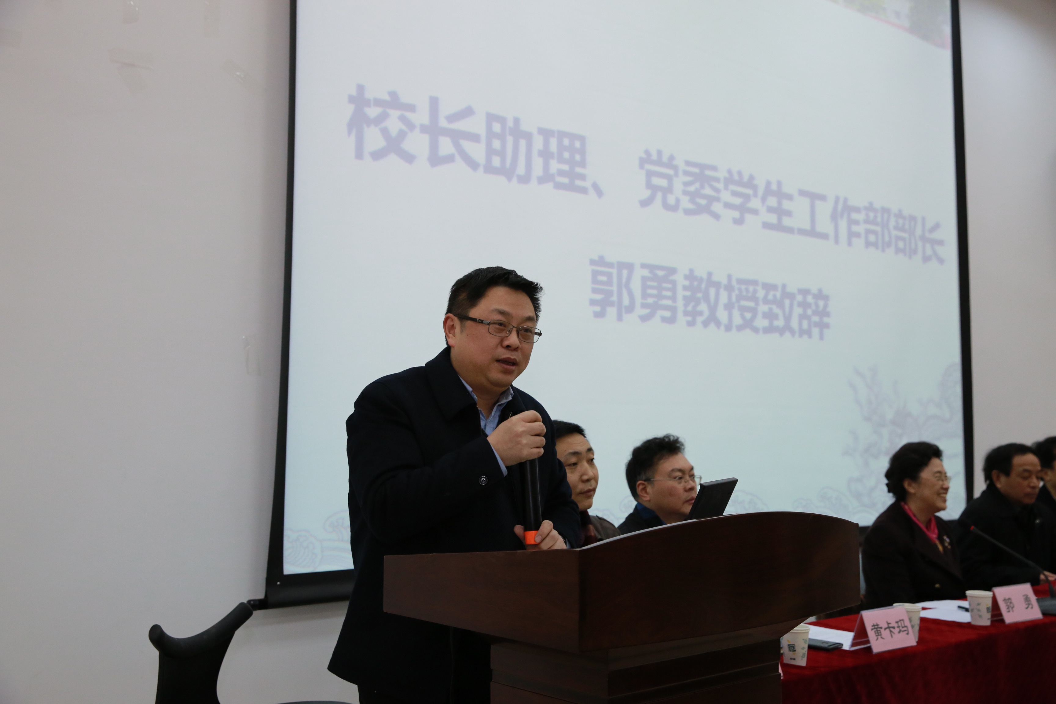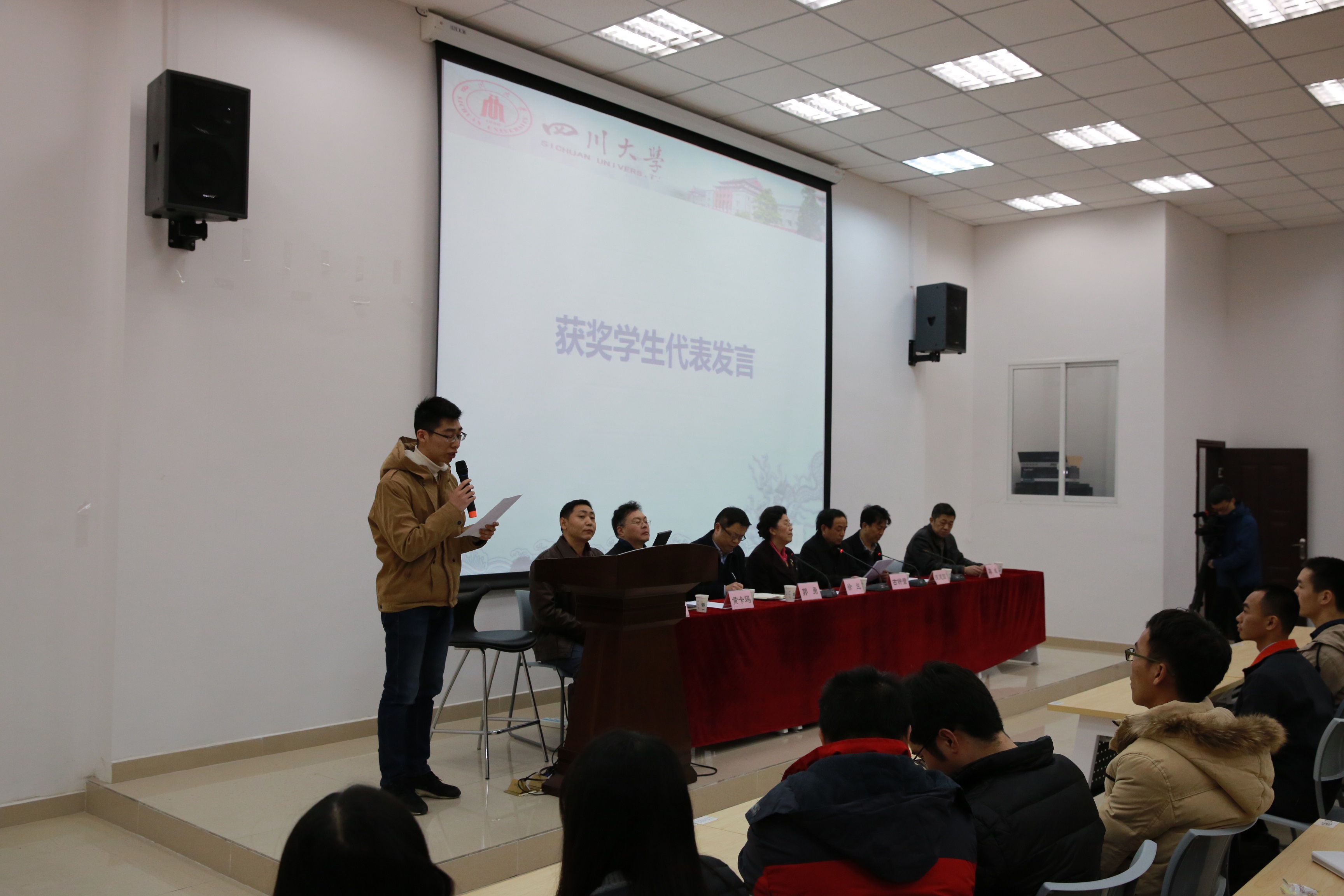 四川大学校长助理、党委学工部部长、学生处处长郭勇教授在颁奖典礼上致辞,他首先向古教授对母校教育事业的大力支持表达了感谢和敬意,同时向获奖学生表示热烈的祝贺。随后发表了自己的一些感想,他认为,态度决定高度,古教授为我们提供的不仅仅是资金,更是一种精神的传承,并号召大家要向古教授学习,学习其对学习、科研和生活的态度,学习其引领学科、服务社会的态度。