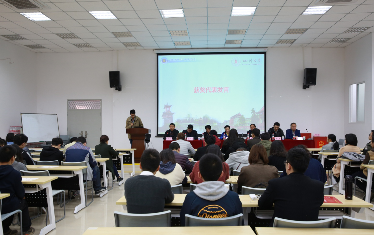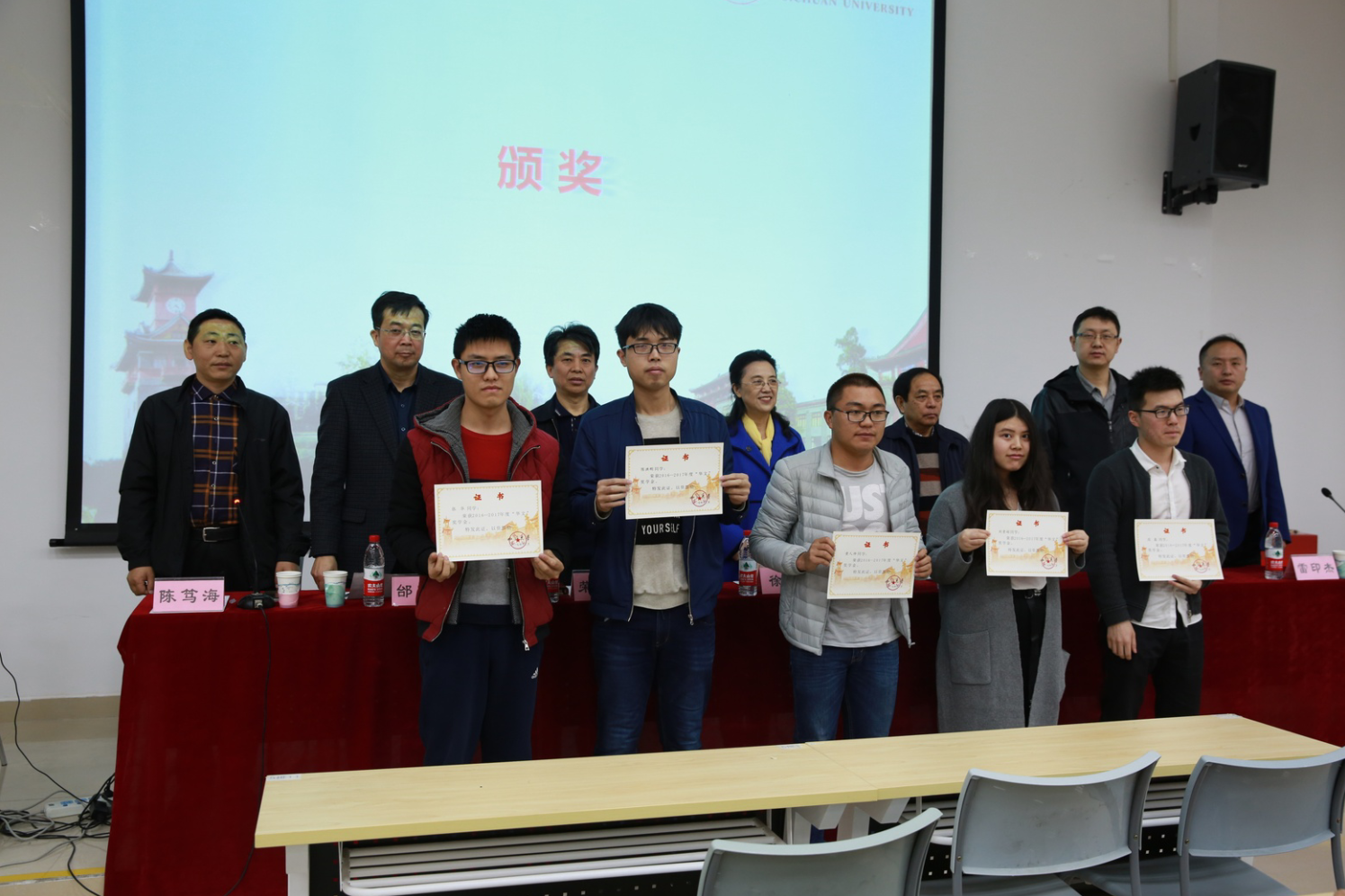 2018年3月9日上午10:00,四川大学华文奖学金颁奖典礼在四川大学西五教附101报告厅顺利举行。华文奖学金评审委员会主任、四川大学老领导徐兰教授,华文奖学金设立者、bat365在线体育登录老教师古钟璧教授,校外联办主任、校友会秘书长荣建国,四川大学全球校友创业家青年创业者联谊会会长、成都万江港利科技股份有限公司总经理贺新,bat365在线体育登录党委书记邰明松,bat365在线体育登录副院长雷印杰,和院党委副书记陈笃海出席了典礼。颁奖典礼由院党委副书记陈笃海主持。