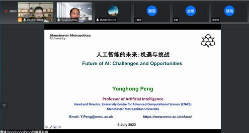 2022年7月6日14:00,英国曼切斯特城市大学人工智能教授(Professor of Artificial Intelligence) 、曼城大校级“先进计算科学研究中心”(Centre for Advanced Computational Science, CfACS)主任彭永红教授应bat365在线体育登录bat365在线体育登录副院长卿粼波教授的邀请,以“人工智能的未来:机遇与挑战”为题为我校师生做了一场精彩的线上学术报告。本次报告由卿粼波教授主持。