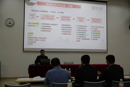 在会上,学院专职组织员彭亮教授就发展党员工作流程作了专题报告,从申请入党、入党积极分子的确定和培养教育、发展对象的确定和培养考察、预备党员的接收、预备党员的教育考察和转正5大模块25个环节,全面系统的介绍了党员发展流程,重点强调了积极分子和预备党员培养阶段的新规变化,结合实践中的案例以及入党材料审核过程中的细节问题,详细讲解了党员发展的工作流程及关键时间节点。并从入党动机、理想信念、思想认识等方面进行了重点说明,并展示了关键程序所对应的归档材料。彭亮教授指出党支部要熟练掌握工作流程,把严格标准、严格培养、严格程序贯穿发展党员工作全过程,切实把好党员发展入口关、质量关、程序关,推进学院党建工作高质量发展。