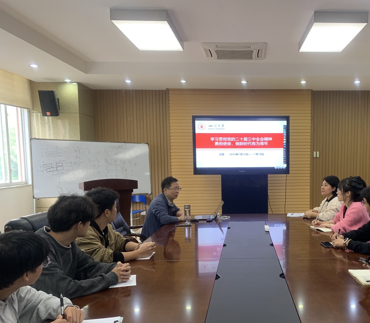 彭舰以深入学习贯彻党的二十届三中全会精神,勇担使命,做新时代有为青年为主题,讲解了会议审议通过的《中共中央关于进一步全面深化改革、推进中国式现代化的决定》的主要内容,从进一步全面深化改革贯彻六条原则、关于经济和民生领域改革、关于深化教育科技人才体制机制改革、关于党的领导和党的建设制度改革等方面重点阐述了党的二十届三中全会的主要精神,并从深化教育综合改革、深化科技体制改革、深化科技体制改革等方面解读了教育、科技、人才是中国式现代化的基础性、战略性支撑的重要论述。