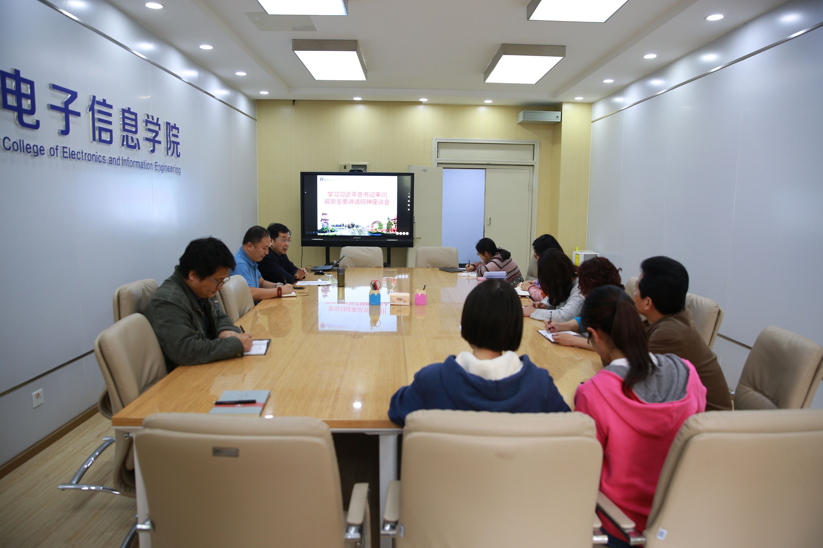 在观看新闻报道后,邰明松书记结合新闻报道的内容,谈了三点体会。一、强调习近平总书记在视察讲话时强调要加强党的政治建设,作为党员要坚持党中央的权威,旗帜鲜明的讲政治,在近年的反腐败工作中,我们看到党在从严治党工作中的决心,要全面落实十九届二中全会和“两会”的精神;二、习近平总书记在视察中强调电子信息产业是实体经济的重要产业,四川大学的“两个伟大”,学校在学科建设中的“信息+”战略部署是人才培养、科学研究转变的重要契机,是中国从中国制造迈向中国创造的重要契机;三、在视察中,习近平总书记以人民群众为中心,走群众路线,忧民、爱民、惠民,解决老百姓息息相关的事情,强调要打好脱贫攻坚战。