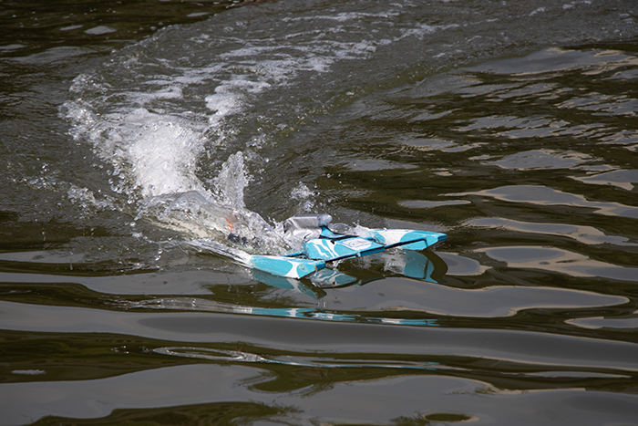 下午三点,水上竞速环节正式开始。在紧张而又热烈的氛围下,选手们一个接一个进行他们的最后一战。随着哨声的响起,选手们的船只向前猛冲,绕过一个又一个的浮标障碍物,在最后的直线道上船只的发动机响起轰鸣声,冲向终点。每一次精彩的表现都迎来在场其他选手、观众们的掌声和欢呼。选手们在赛场中碰撞智慧,比拼才能,共同成就了一届精彩圆满的青春盛会。临近黄昏,最后一支队伍的冲线宣告了本次船模大赛决赛的圆满完成。