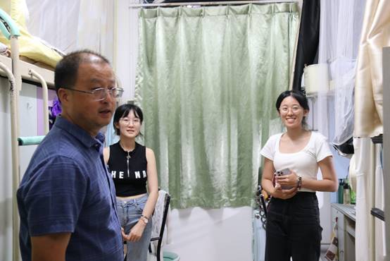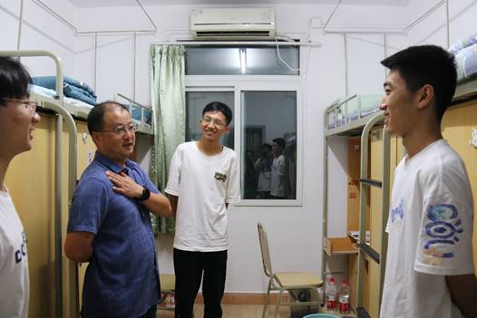 为深入了解新生入住寝室后的生活情况,2023年9月8日19时,学院副院长张启灿带队走访新生寝室,2023级本科辅导员陈林、申鑫参加。
