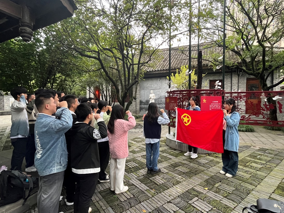 结束川大博物馆的参观后,同学们来到主题活动的第二站:江姐纪念馆。参观过程中,同学们保持严肃认真的态度,仔细阅读江姐的生平事迹与其所带来的精神价值,并深入思考红岩精神的现代意义。参观期间,陈骊琏同学带领全体团员面对团旗重温入团誓词“我志愿加入中国共产主义青年团,坚决拥护中国共产党的领导..... 为共产主义事业而奋斗!”一个个铿锵有力的字符响彻整个纪念馆,支部全体团员的思想信念得到进一步坚定,纷纷表示将努力学习江竹筠烈士在川大学习和参与革命斗争的英雄事迹,让自己更加自信地面对未来,立志带着这份革命信仰和精神力量奔赴祖国发展的各个行业,充分展示川大青年学子的使命担当!