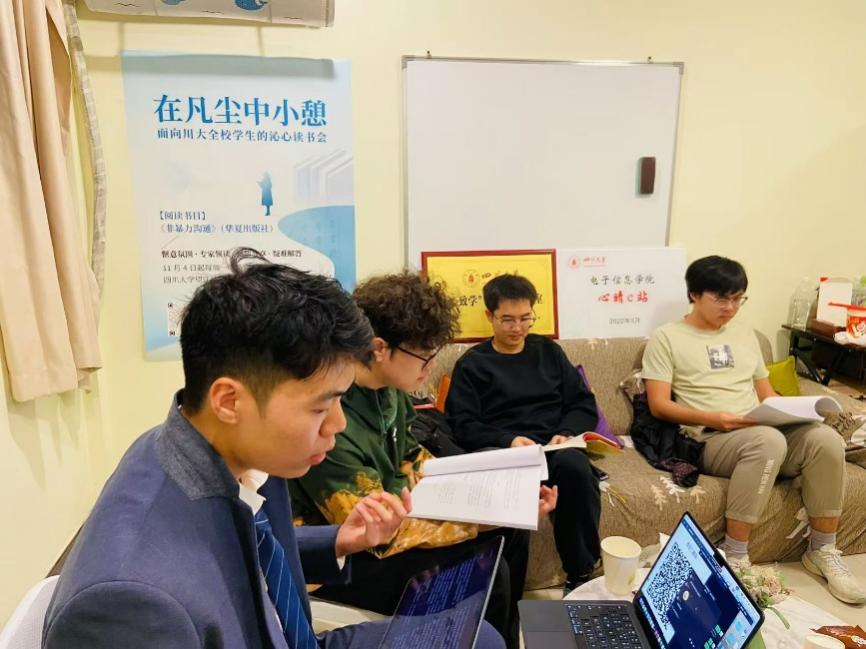 2024年11月4日下午7点,由bat365在线体育登录主办、bat365在线体育登录二级心理辅导站和四川大学“e心致学”辅导员工作室联合承办的“在凡尘中小憩”沁心读书会第一次活动在四川大学望江校区东三教学楼525室顺利举办。本次活动由何惠老师现场参与并指导,辅导站学生站长李岩峰主持并领读,线上线下同时开展。