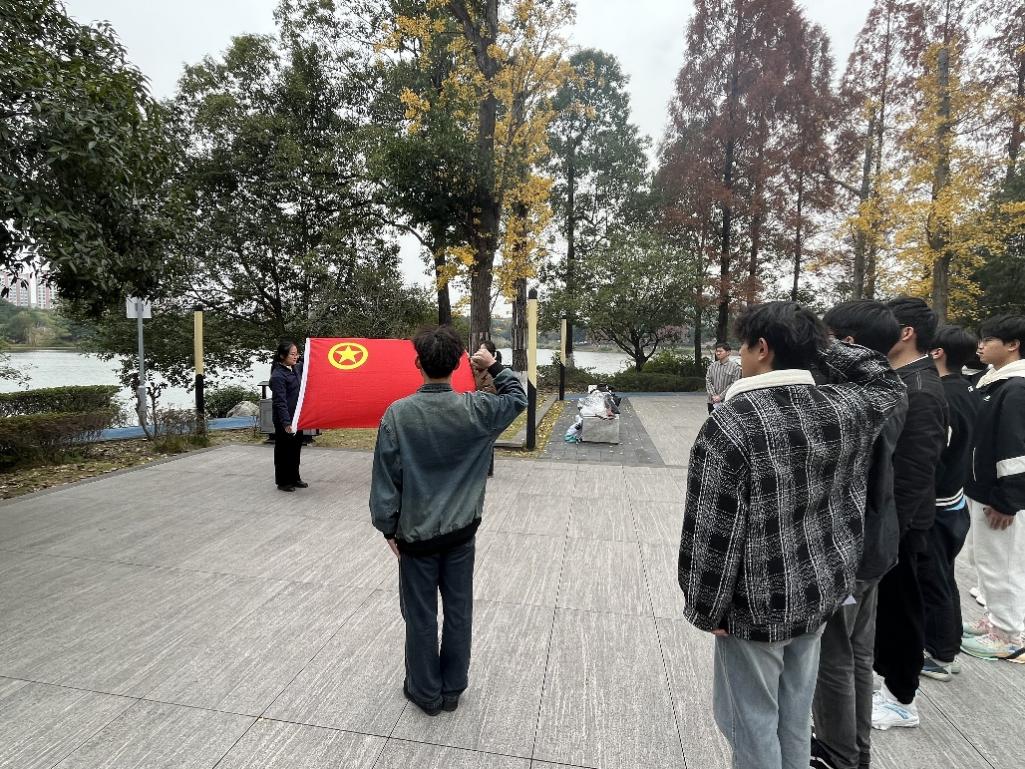 紧接着,新团员入团仪式正式开始。院团委学生副书记徐展翼宣读新团员名单,院团委副书记申鑫为新团员逐一佩戴团徽。在朱远诚的带领下,新团员们面向团旗,庄严宣誓,誓言坚定有力,充分展现了青年一代的责任与担当。最后,新团员代表贾泽坤上台发言。他结合国家公祭日的意义,提出作为新时代青年应牢记历史、奋发图强,以青春之名立鸿鹄之志,并表示将珍惜此次入团机会,不断提升自身的思想觉悟和综合素质。其发言诚恳务实,彰显了对未来的坚定信念与决心。