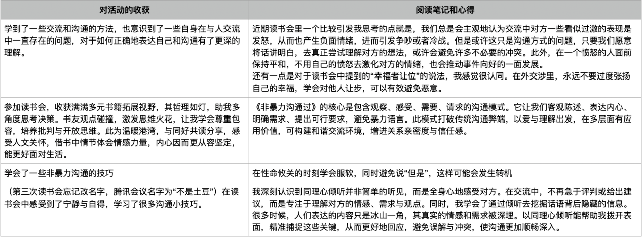通过本次读书会,同学们对《非暴力沟通》中“以同理心倾听”、“ 同理心的力量”两个章节有了更进一步的理解,在探索自我同理心、与他人构建同理连接上有了进一步认识。同时部分持续参加的同学表示,在深入阅读这两章节内容后,对前几章节所读部分有了更深层次的理解,他们非常期待继续阅读和学习书中余下的部分,更好的理解和学习非暴力沟通技能。