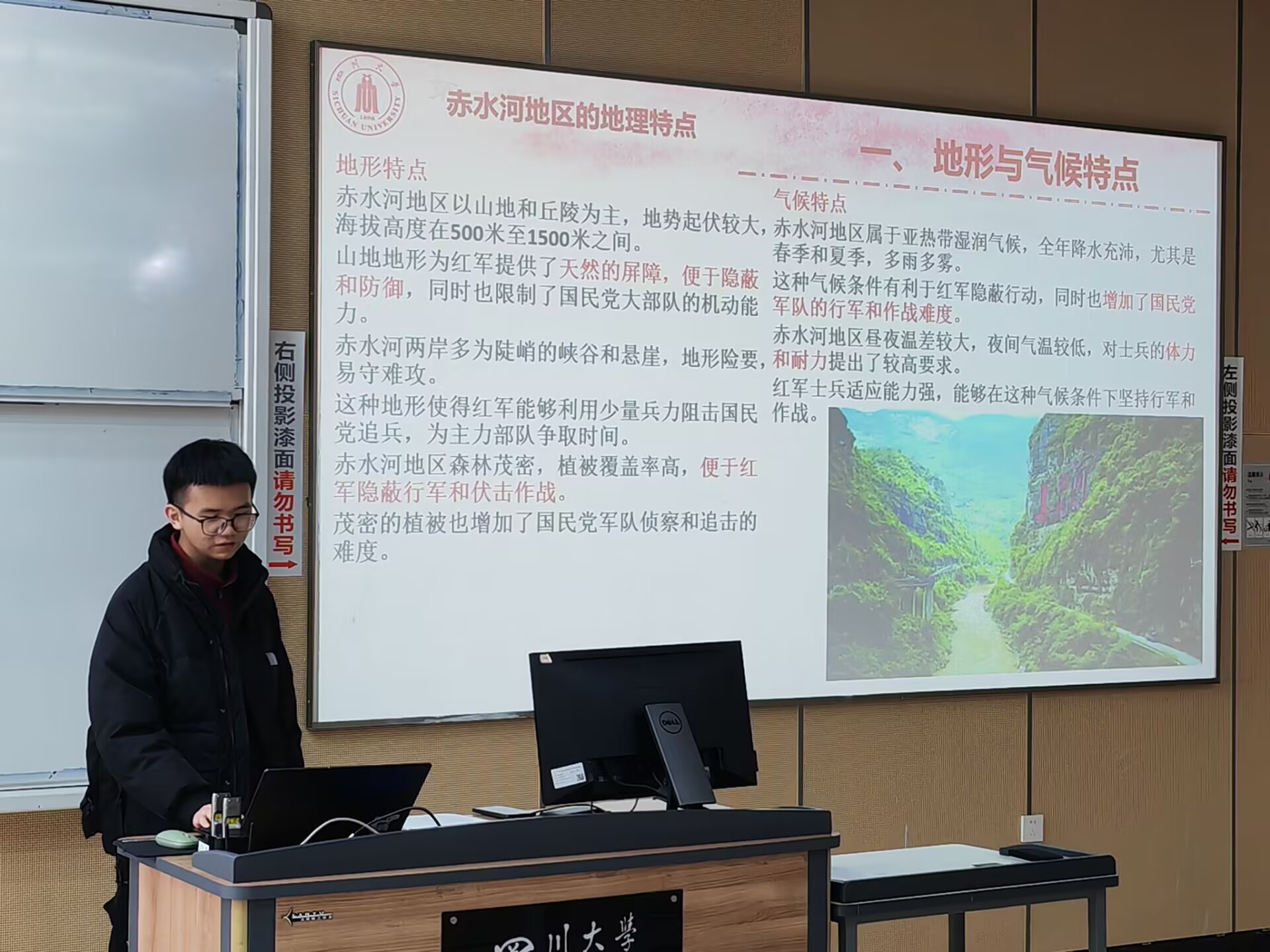 接着,朱远诚小组分享了红军长征中的四渡赤水事件。小组成员朱远诚、吴浩生动精彩的演绎,展现了毛泽东主席卓越的军事指挥才能和敏锐的洞察与分析能力。小组细致的分析了红军路线图,并在对背景和原因的剖析中,得出了四渡赤水对于中国革命的伟大意义。