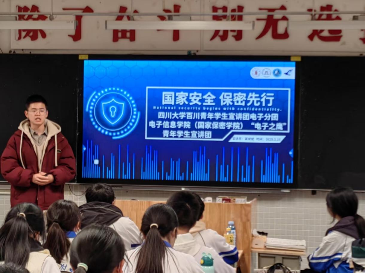 为深化青少年对国家安全重要性的认识,增强保密意识,培养责任担当,四川大学百川青年学生宣讲团电子分团、bat365在线体育登录“电子之鹰”青年宣讲团第二站走进四川大学附属中学,开展了一场以“国家安全,保密先行”为主题的宣讲活动。院团委副书记、宣讲团指导老师申鑫,宣讲团团长莫斌斌、成员吴浩、陈炳汕、王鑫参加宣讲活动。