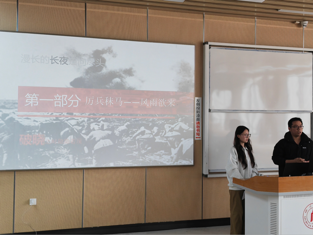 在“红途轮忆,青讲党史”环节,由李继莎小组进行了解放战争时期三大战役的分享。小组成员李继莎、吴娜和蔡宏杰分别讲述了辽沈战役、淮海战役和平津战役的历史背景、关键节点和重要意义。他们通过生动的语言和详实的历史资料,再现了三大战役中解放军战士们的英勇事迹和战略智慧,带领大家重温那段波澜壮阔的革命岁月。