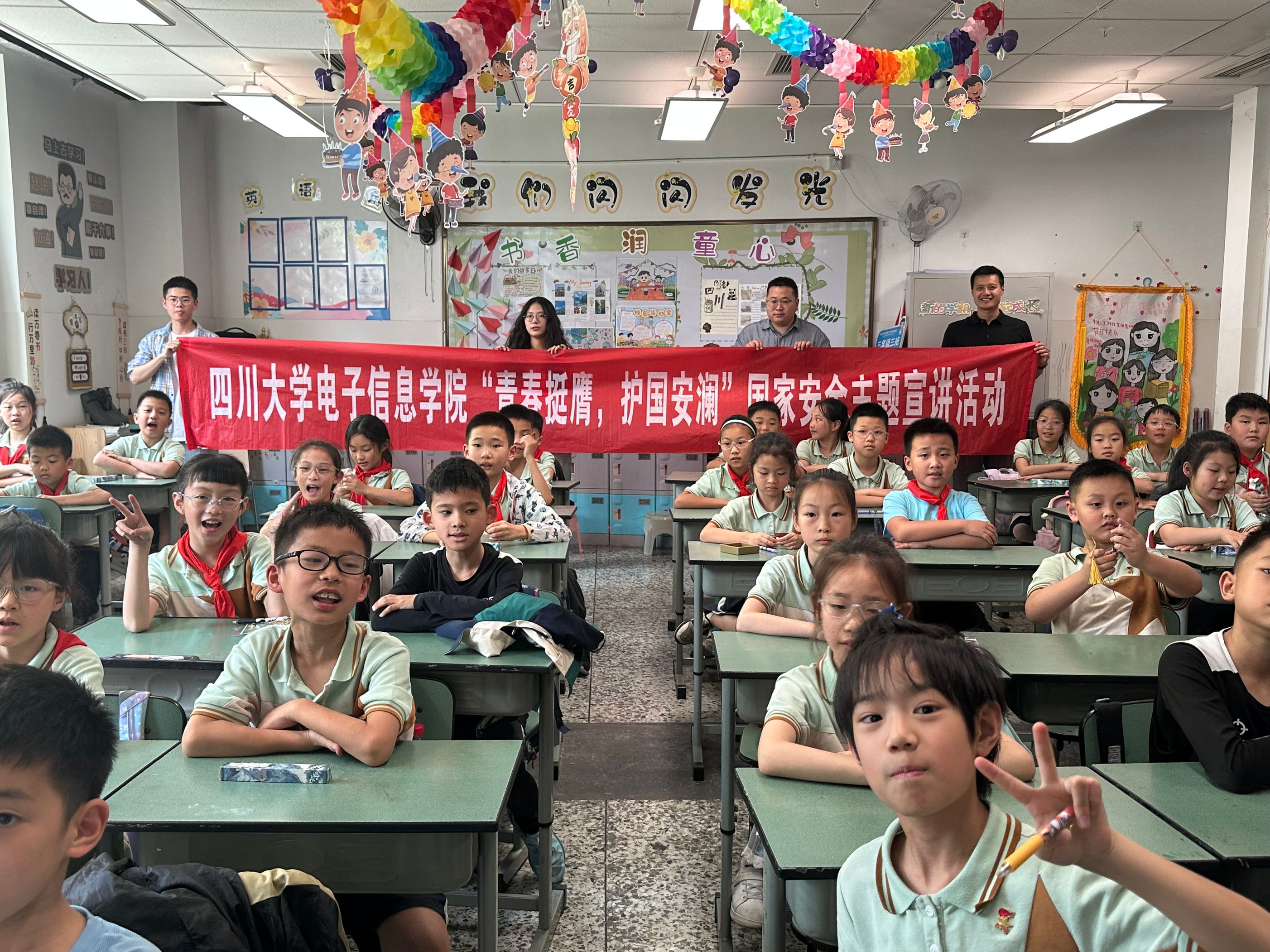 为全面贯彻落实总体国家安全观,进一步增强青少年的国家安全意识,2025年5月12日,四川大学百川青年学生宣讲团电子分团、bat365在线体育登录(国家保密学院)“电子之鹰”青年宣讲团走进成都市盐道街小学,举办“国家安全,保密先行”主题宣讲活动,为小学生们呈现了一堂生动有趣且富有教育意义的国家安全课程。院团委副书记、宣讲团指导老师申鑫,兼职辅导员杨婉丁,宣讲团团长莫斌斌、成员陈炳汕参加活动。
