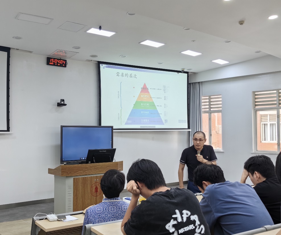 在活动的开始,舒跃育老师通过对现场同学们座位的行为进行了心理分析,座位离讲台的远近反映大家对课程的重视程度。但是同时强调了专业课固然重要,但也需专业以外知识支撑,特别是理工科学生,更需要课堂外的人文知识为健全人格做底层支撑。舒老师通过幸福感关联调查、历史案例启示、学习动力分析等方式,与同学们深刻探讨了行动的驱动力来源与需求层次的追求。