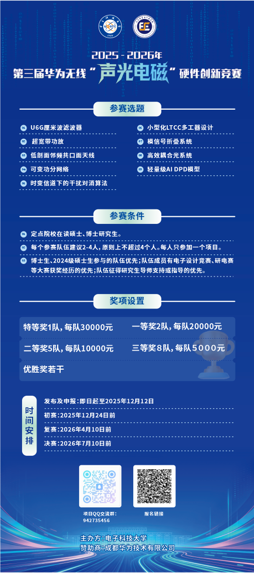 关于2025年-2026年第三届华为无线“声光电磁”硬件创新竞赛发布的通知https://www.ese.uestc.edu.cn/info/5385/22693.htm