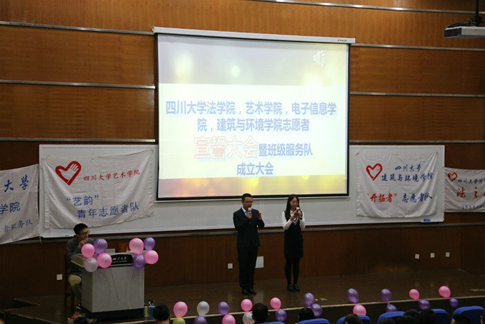 2017年10月21日星期六19点30分,bat365在线体育登录,艺术学院,建筑与环境学院,法学院四院联合在四川大学江安校区综合楼C座407举办了2017年度青志宣誓大会暨班级服务队成立大会。参与此次宣誓大会的嘉宾有华西药学院,高分子科学与工程等学院的青志队长。