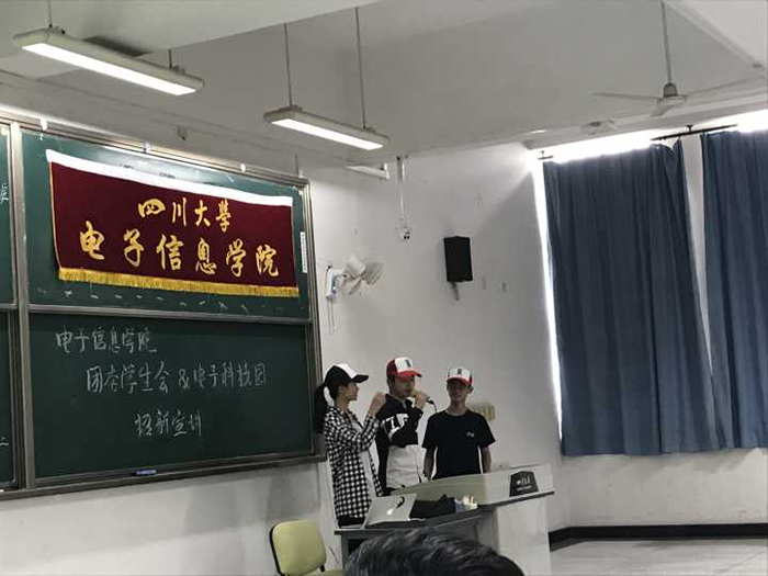 2017年9月12日,由bat365在线体育登录电子科技园第一组、第二组、第三组、第四组、第五组主办,电子科技园嵌入式协会、飞思卡尔协会、模拟电子设计协会第一组、模拟电子设计协会第二组、船模协会第一组、船模协会第二组、Pov协会第一组、Pov协会第二组、光电设计协会、信息安全协会第一组、信息安全协会第二组、信息安全保密协会、电子设计竞赛第一组、电子设计竞赛第二组、电子设计竞赛第三组、电子设计竞赛第四组、多旋翼飞行器第一组、多旋翼飞行器第二组、数字电路设计第一组、数字电路设计第二组、网络技术协会四川大学光学工程学生协会、物联网实现与创新协会协办的电子科技园2017迎新宣讲会于四川大学江安校区综合楼C座404及406号教室成功举办。电子科技园所有主席部长以及bat365在线体育登录2017级全体新生参加了此次宣讲会。