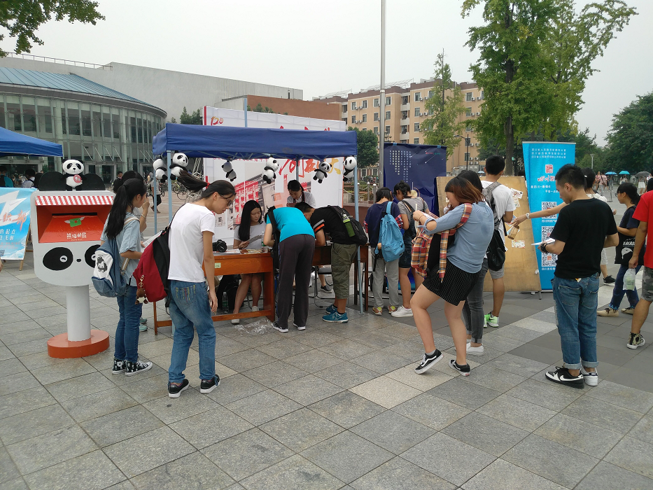 活动于上午12时准时开始。可爱的熊猫邮筒和玩偶,带着浓浓四川味道的定制明信片很快就吸引了一大波的同学。遇到不了解四川发布app的同学,志愿者们耐心为他们作详细介绍并鼓励他们下载。当同学们下载完app的时候,志愿者们带领他们挑选喜欢的明信片并提议他们可以在中秋节来临之际为家人朋友寄上祝福。下午18时,在最后一位同学将明信片投入邮筒之后,活动正式结束。