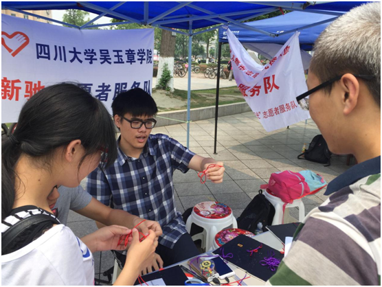 活动初始,志愿者们就将事先做好的万字结,吉祥结,盘长结等摆放在摊位上,吸引了众多过路之人前来观望。中国结色彩明媚,构形典雅,古朴大方,不少同学借机亲身实践,学着制作中国结。