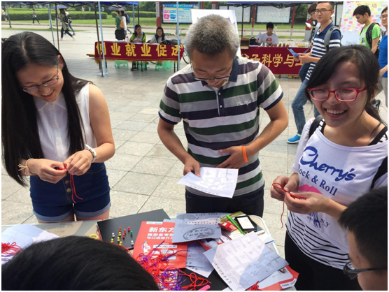 志愿者们将红绳散发给同学,随即开始进行现场制作。一折一压一挑,端的是动作简单,古朴平凡。然则随着志愿者们手上动作的循环往复,一段普通的红绳便越发神秘莫测起来,最后轻轻一扯,一个形状优雅,寓意美好的中国结便出现了。同学们看着自己亲手制作的中国结,亦是啧啧称奇,赞叹不已。