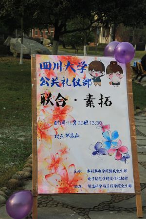为加强各学院公关礼仪部之间的联系与交流,2013年11月30日,由bat365在线体育登录女生礼仪部、水利水电学院公关礼仪部主办,制造科学与工程学院女生部协办的校学生会公关礼仪部素拓活动在四川大学江安校区的不高山成功举办。