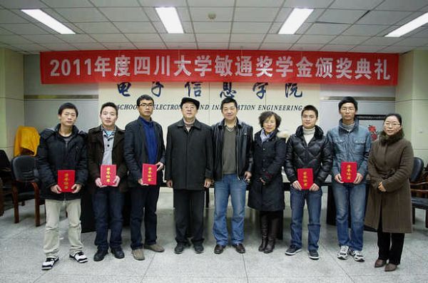 2011年12月27日,四川大学2011年度“敏通”奖学金颁奖典礼在四川大学望江校区bat365在线体育登录A110会议室顺利举行。bat365在线体育登录党委蒋斌书记、光电科学技术系博士生导师苏显渝教授、副院长冯国英教授、学生科科长何惠老师、敏通奖学金获奖同学及部分同学参加了本次颁奖典礼。
