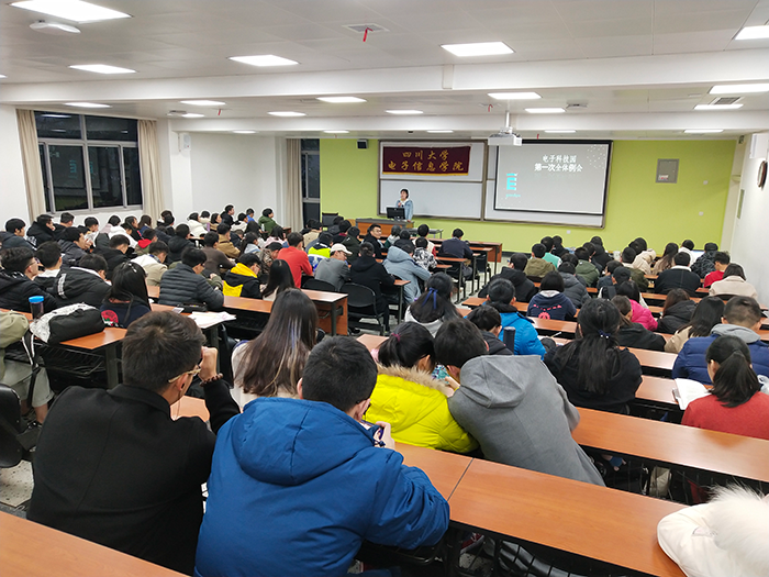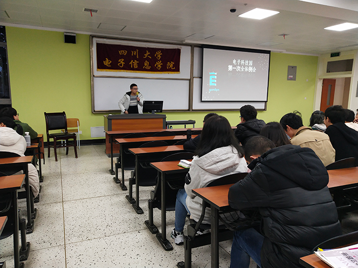 2019年3月2日,由电子科技园模拟电子设计协会第一组、电子科技园模拟电子设计协会第二组、电子科技园嵌入式协会、电子科技园光电设计协会、电子科技园飞思卡尔协会、电子科技园多旋翼飞行器(第一组)、电子科技园多旋翼飞行器(第二组)、电子科技园数字电路设计(第一组)、电子科技园数字电路设计(第二组)主办,电子科技园第一组、电子科技园第二组、电子科技园第三组、电子科技园第四组、电子科技园第五组、电子科技园POV协会第一组、电子科技园POV协会第二组、电子科技园船模协会第一组、电子科技园船模协会第二组、电子科技园电子设计竞赛(第一组)、电子科技园电子设计竞赛(第二组)、电子科技园电子设计竞赛(第三组)、电子科技园电子设计竞赛(第四组)、电子科技园信息安全保密协会、电子科技园信息安全协会(第一组)、电子科技园信息安全协会(第二组)、电磁智能车协会、物联网实践与创新协会、网络技术协会协办的电子科技园第一次例会在四川大学江安校区第一教学楼B座举行。电子科技园主席团、部长团以及全体干事参加了此次例会。
