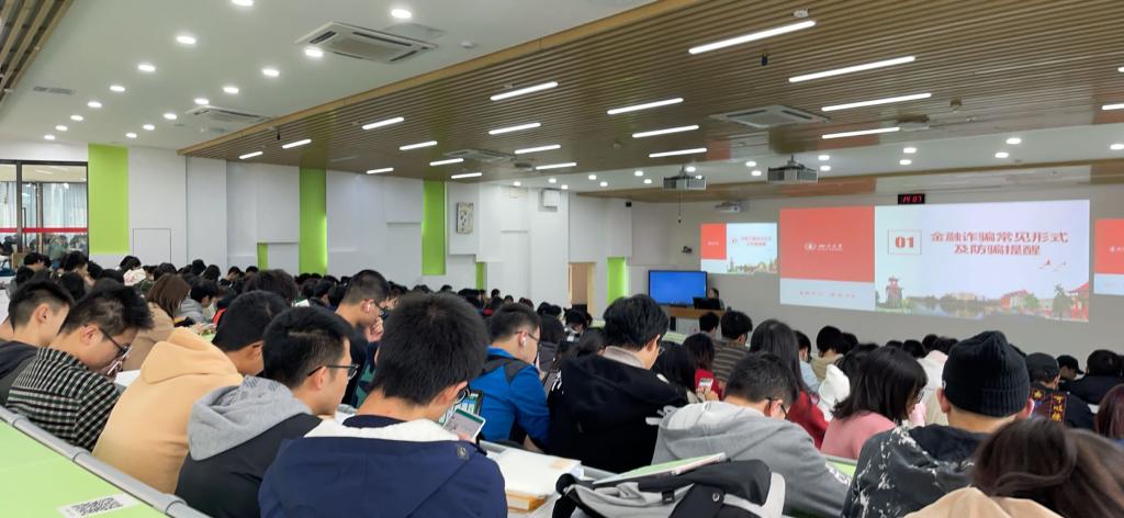 陈林老师和李运国老师通过实际案例生动形象的讲解了金融诈骗的几大主要手段:校园贷、网络诈骗、高级金融诈骗等,并针对各种诈骗手段给出了有效的应对策略,传授识别金融诈骗的技巧。还通过具体案例针对校园网贷的特点、风险以及存在的危害进行了讲解。引导学生树立健康向上的消费观念。