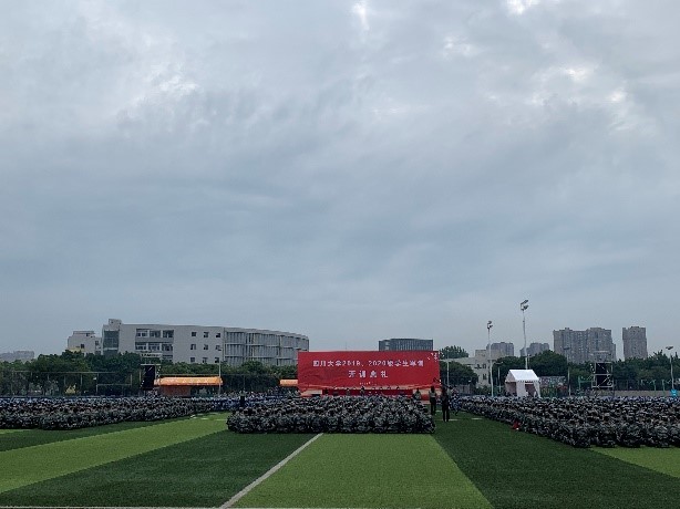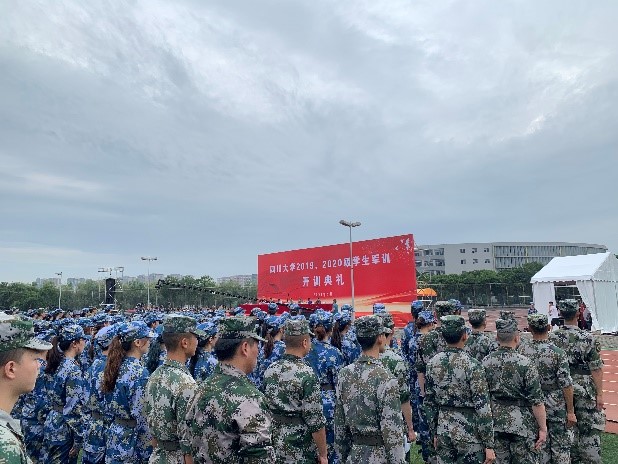 2021年7月8日早上9点20分,四川大学2019、2020级学生军训开训典礼,在江安校区2号体育场隆重举行。四川大学党委副书记郭勇、双流区委常委、区人民武装部部长董洪荣等相关领导出席开训典礼,同时出席的有军训师教官与带队辅导员。8500余名学生代表参与此次开训典礼。典礼由四川大学学生工作部、武装部部长,本次军训总指挥陈森主持。