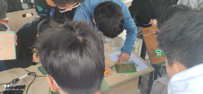 早上8点,“花样焊电阻”活动正式开始。参与活动的同学在现场领取一块洞洞板与一份电阻后即可开始自己的创作。凭借自己无穷的想象力,或是用铅笔描绘,或是用指头虚画,电阻图案的设计图便呈现于此。此后,便是电阻的拼接了。这一步骤较为简单,相比之下之后的电阻焊接更有挑战性。高年级的同学们游刃有余地使用电烙铁焊锡以固定电阻于洞洞板上,而首次接触电烙铁的新生在学长学姐的示范指导下操作着。最后,用剪刀剪下电阻的较长引脚,一份蕴含着自己创意的由电阻组成的画作便大功告成了。下午6点整,“花样焊电阻”活动正式结束。纵使焊接电阻的过程并非一帆风顺,但由同学们亲手创造的成品总是令人满意与自豪。