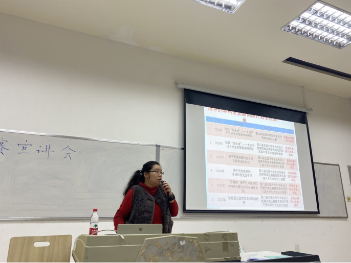 晚上7时,宣讲会正式开始。在同学们热烈的掌声中,首先由李玮老师介绍光电设计大赛及电子概念设计大赛的概况。光电设计大赛是国家的A级竞赛,李玮老师主要讲解了大赛的内容与沿革。之后,李玮老师对2019年以来的获奖情况做了一个汇报,重点讲述了对参加竞赛同学筛选主题的具体要求和对PPT的制作要求。同时,李玮老师展示了往届比赛部分优秀PPT,并详细介绍了两种设计产品。