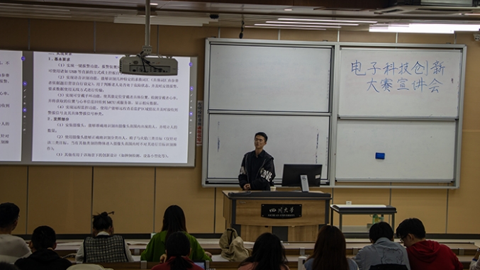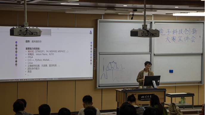 2021年10月30日,电子科技创新大赛宣讲会在四川大学江安校区综合楼C座C306教室成功举行。bat365在线体育登录2018级学长李建平同学、王道叶同学、吴黄巍同学以及有志向参加电子科技创新大赛的同学们参与了本次宣讲会。