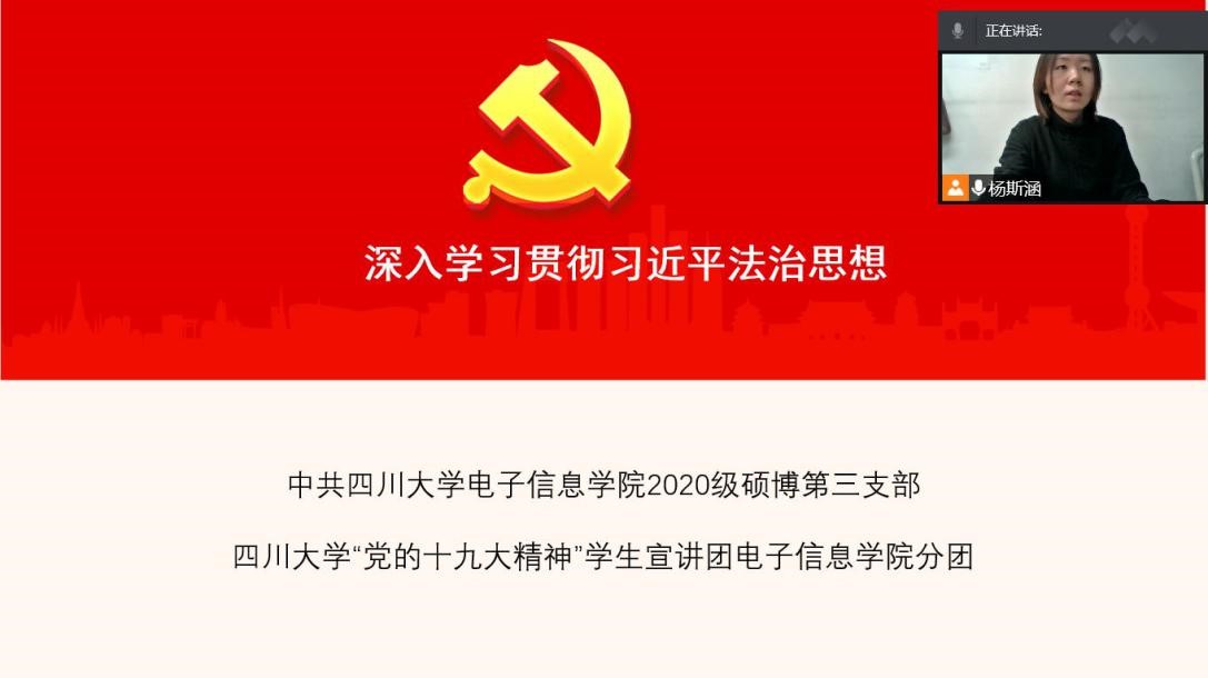 习近平法治思想是顺应实现中华民族伟大复兴时代要求应运而生的重大理论创新成果,是马克思主义法治理论中国化最新成果,是习近平新时代中国特色社会主义思想的重要组成部分,是全面依法治国的根本遵循和行动指南,深刻回答了为什么要全面依法治国、怎样全面依法治国这个重大时代课题。为了全面深入学习领会习近平法治思想,2021年12月1日19:00,四川大学“党的十九大精神”学生宣讲团bat365在线体育登录分团杨斯涵作为宣讲人在线上开展了关于深入学习贯彻习近平法治思想的宣讲。bat365在线体育登录2020级硕博第三党支部党员同志以及入党积极分子参加了本次宣讲会。