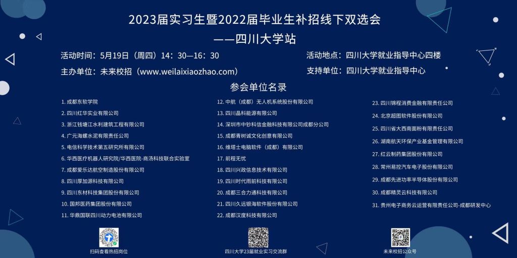 现场双选 | 5月19日 | 2023届实习生暨2022届毕业生补招线下双选会—四川大学⏰时间:2022年5月19日(周四)14:30—16:30 📍地点:四川大学就业指导中心四楼欢迎加qq群了解更多:742717438
