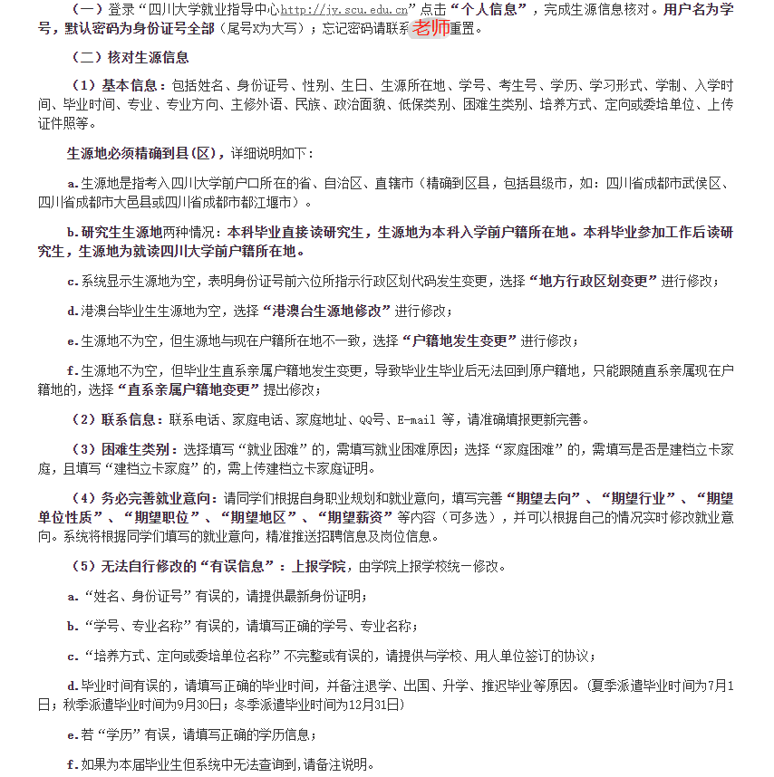 生源信息填写完整、准确并经个人和学院确认后的毕业生,才能在毕业生就业网打印“四川大学毕业生就业推荐表”和“四川省普通高等学校毕业生就业协议书”。请每一位毕业生和各单位高度重视,按照相关要求做好此项工作。