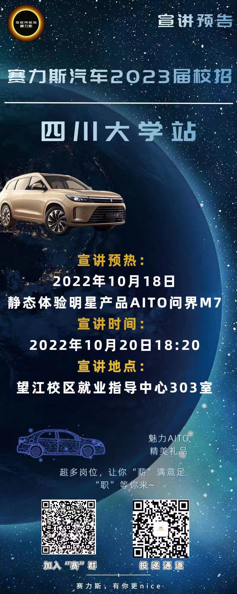 宣讲预热:10月18日(周二)全天,AITO问界系类明星产品问界M7将会驶进川大望江校区,带你领略AITO问界M7的魅力,和技术专家面对面沟通。