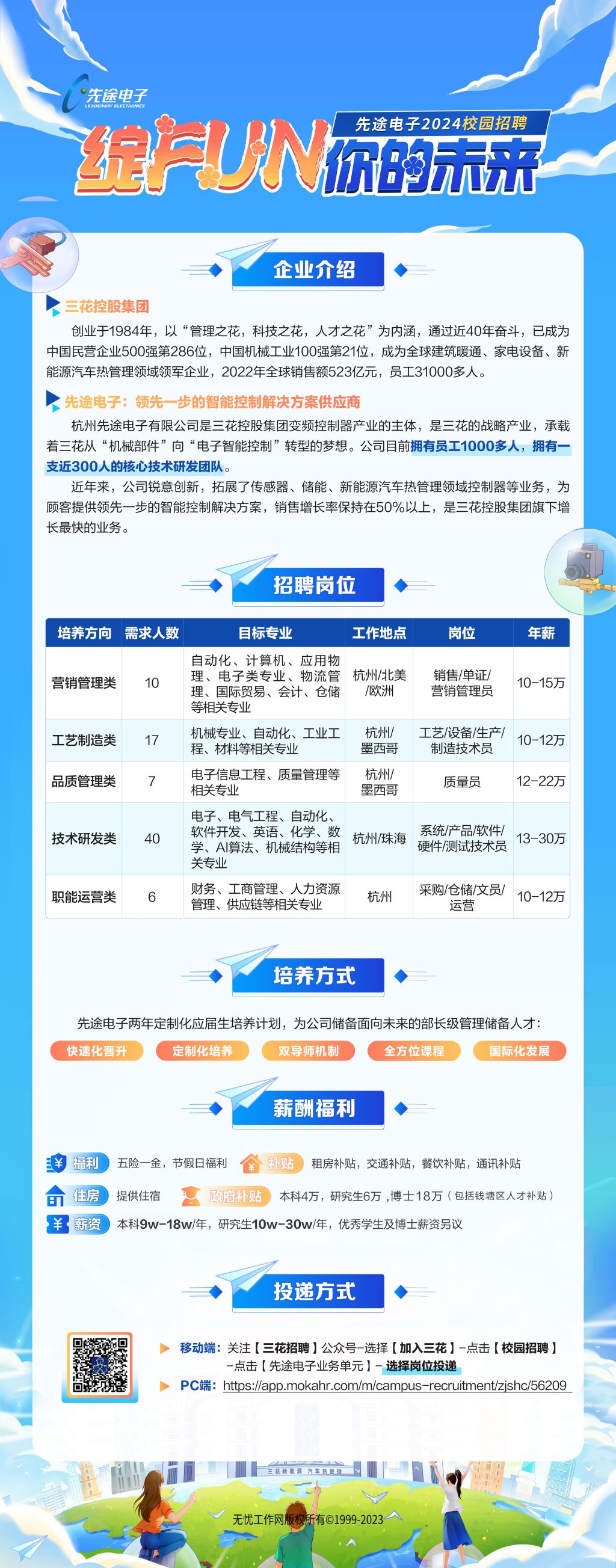 三花控股集团-杭州先途电子有限公司2024秋招宣讲会-成都站正式启动 研发副总亲临现场 可指导就业方向四川大学(望江校区)宣讲时间:10月13日下午15点20分宣讲地点:就业指导中心305室到场惊喜:面试直通卡抽选、优先面试圈、精美伴手礼~共计100+offer,五大岗位类型,研发类13-30w,营销类10-15w,品质管理类12-22w,工艺制造类10-22w,职能运营类10-12w【关于公司】 三花控股集团创业于1984年,中国民营企业500强第215位,中国机械工业100强第21位,全球建筑暖通、家电设备、新能源汽车热管理领域领军企业,2022年全球销售额523亿元,员工31000多人。杭州先途电子有限公司是三花控股集团变频控制器产业的主体,是三花的战略产业,近年来,公司锐意创新,拓展了传感器、储能、新能源汽车热管理领域控制器等业务,为顾客提供领先一步的智能控制解决方案,是三花控股集团旗下增长最快的业务。【六大体系】 研发、营销、制造、质量、供应链、职能 【面向对象】2023年9月~2024年7月,海内外高校应届生 【工作城市】杭州or珠海,杭州为主,部分岗位有海外工作机会 简历投递方式:扫描下方海报二维码进行岗位选择特别说明:考研、考公的同学可凭录取通知书免违约金 期待和你携手 迈向先途 成就未来