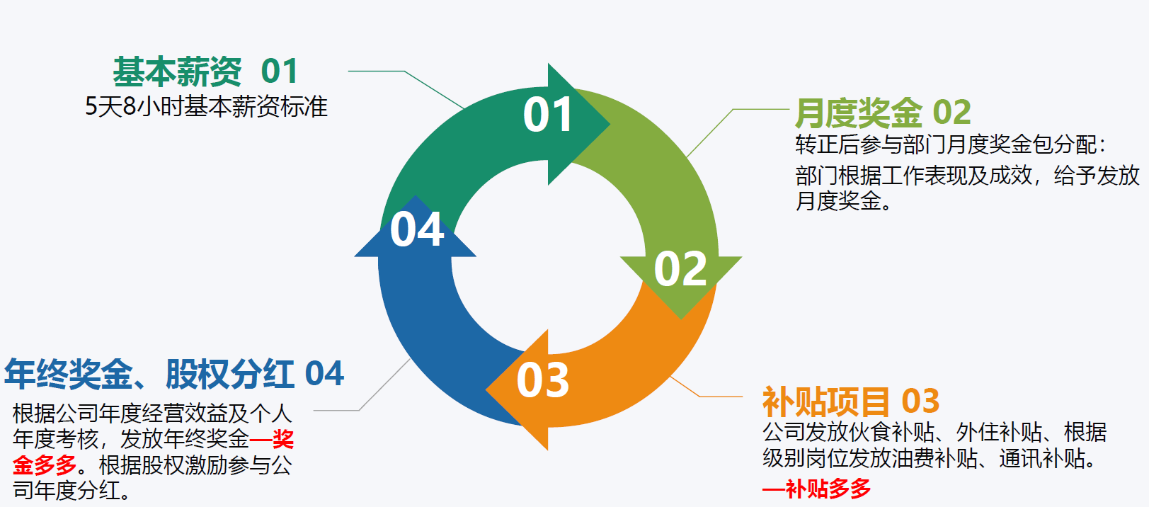 年终奖、项目奖、优秀员工奖、优秀提案奖、多次调薪、五险一金、带薪年假、婚假、产假、激励金无息借款、人才引进补贴、提供食宿、核心人才股权激励......