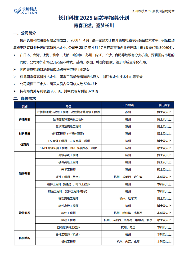 杭州长川科技股份有限公司,半导体行业,上市公司,封测装备龙头企业,目前正处于快速发展阶段,特组织专场宣讲会: