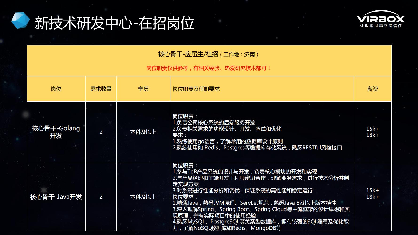 3. 岗位:Go语言研发、Java研发工程师、客户端APP开发(flutter框架)、硬件研发、测试经理(详情可查看企业介绍pdf);