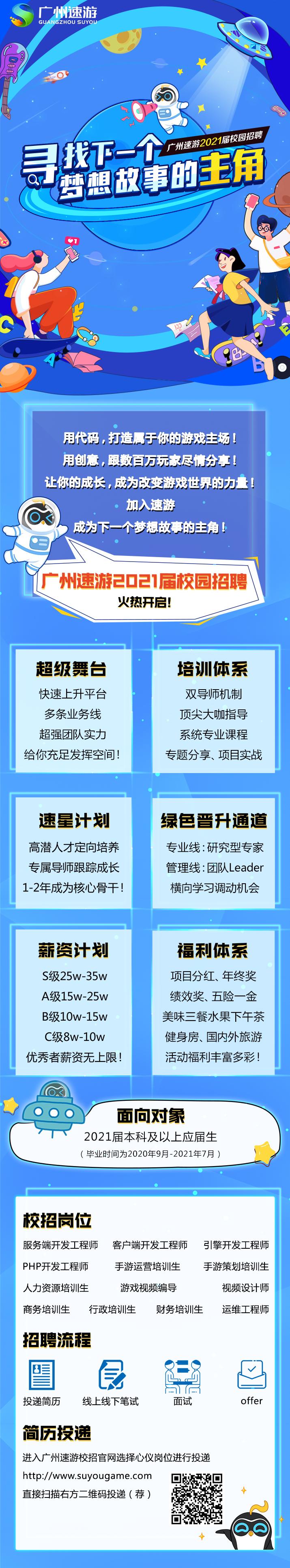 详情请关注速游官方招聘微信公众号:suyou-game或狠戳速游官网http://www.suyougame.com/school/index.html进行查询。