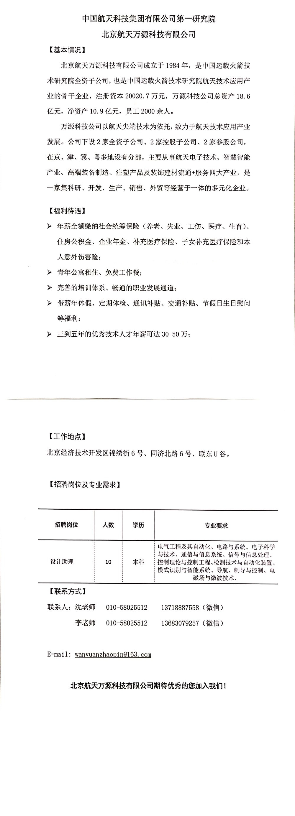 北京航天万源科技有限公司春季招聘(设计助理-本科-10人)