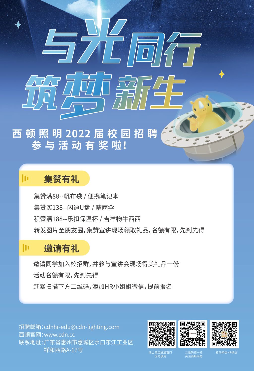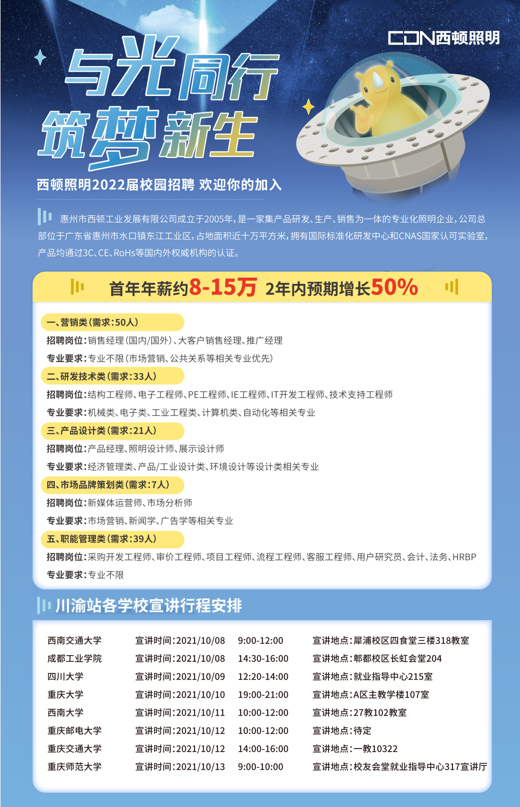 西顿照明---四川大学站即将开始专场招聘会等你来!年薪约8-15万 免费吃住,每年至少一次调薪机会;“狮”系列发展路径,专人带教,各种学习机会、旅游、体检等多项福利【网申链接】:https://www.cdn.cc/CampusRecruitment/ (一键式投递)【投递邮箱】:cdnhr@cdn-lighting.com【公司官网】:www.cdn.cc