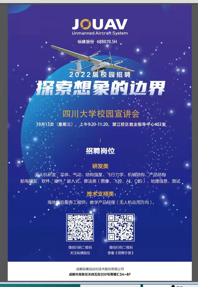 公司已形成尊重员工、培养员工、保护员工、成就员工的企业文化,促进员工个体价值实现与公司价值实现融合,个人梦想和公司愿景统一,诚邀有志于无人机行业发展的志士加盟!