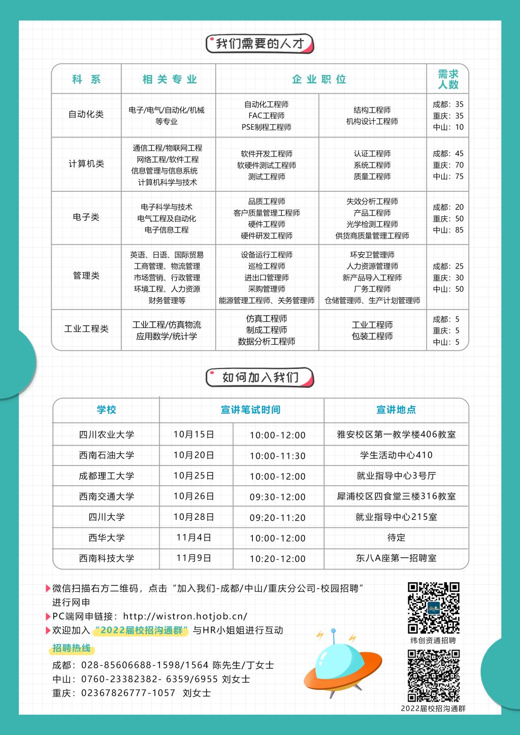 因学校疫情防控政策,纬创原定10/28上午在就业指导中心215室宣讲会已取消,现诚邀各位同学参加纬创资通2022届校招空中宣讲会(四川大学专场)宣讲方式:腾讯会议宣讲主题:纬创资通2022届空中宣讲会(四川大学)宣讲时间:2021/10/28 10:00-11:00 (GMT+08:00) 中国标准时间 - 北京
