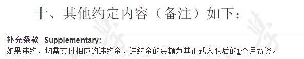 要考公务员的同学,签订协议时:所签单位如果同意考上公务员不收违约金,尽量写在协议上,否则在执行的时候,可能要交违约金。曾经就有同学因为没有写进协议,公司最开始口头同意可以不给违约金,但是最后执行的时候违约金给了2万,特此提醒。违约条款例子如图: