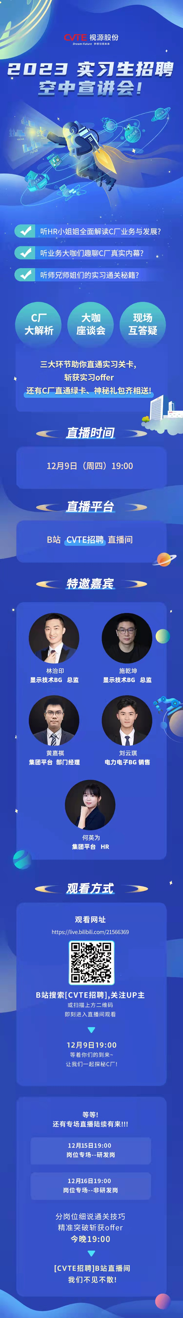 📨【一键投递】 进入官网campus.cvte.com 选择〔2023实习生招聘(含寒暑期)〕网申,了解更多岗位详情~