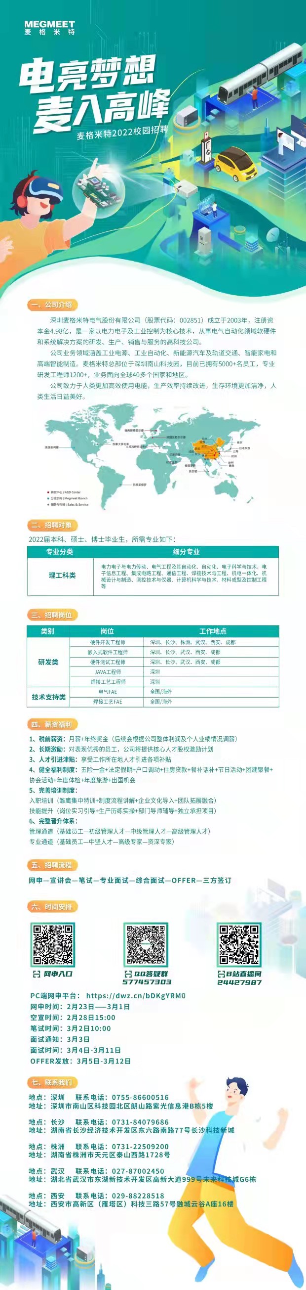 快来领取麦格米特春招offer啦网申时间:2月23日-3月1日(https://dwz.cn/bDKgYRM0)直播时间:2月28日15:00(B站房间号:24427987)笔试通知:3月1日笔试时间:3月2日10:00面试通知:3月3日面试时间:3月4日-3月11日offer发放:3月5日-3月12日麦格米特期待您的加入