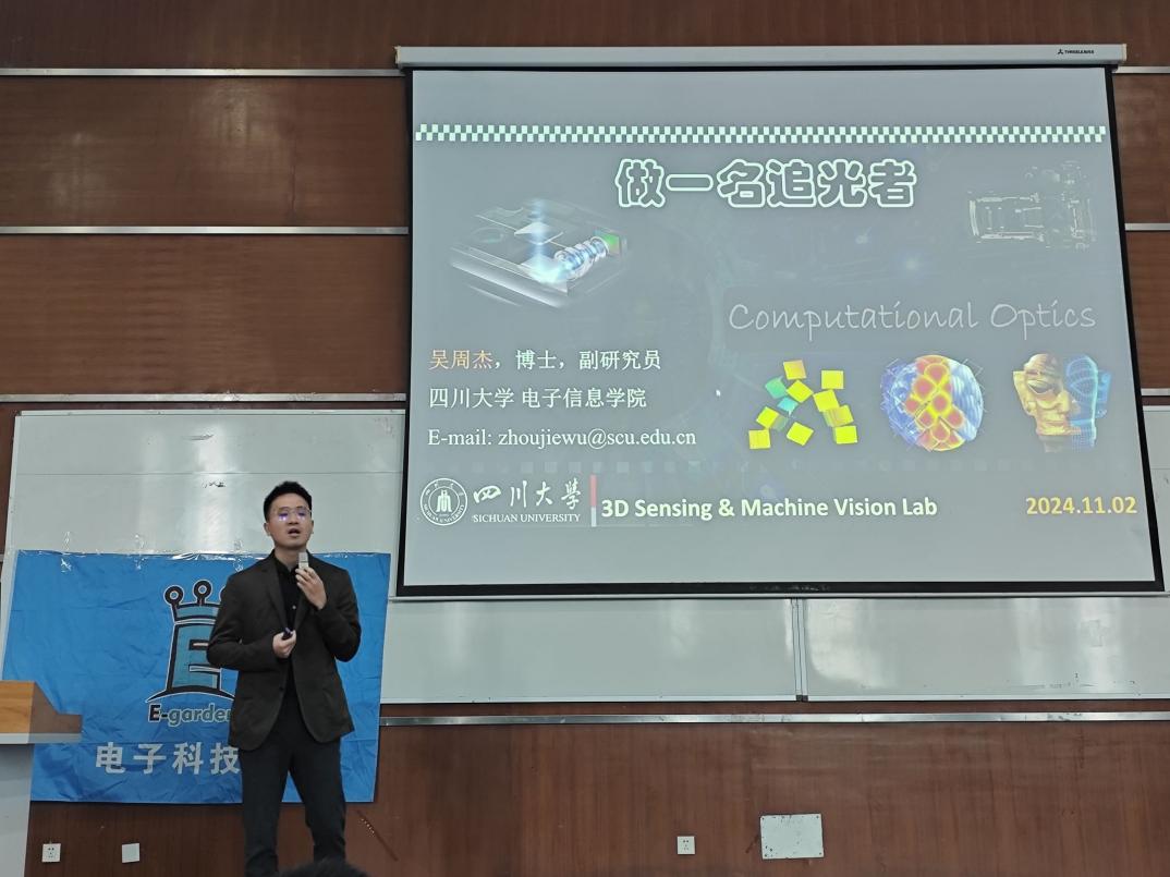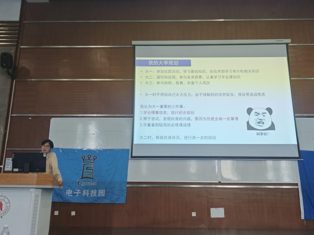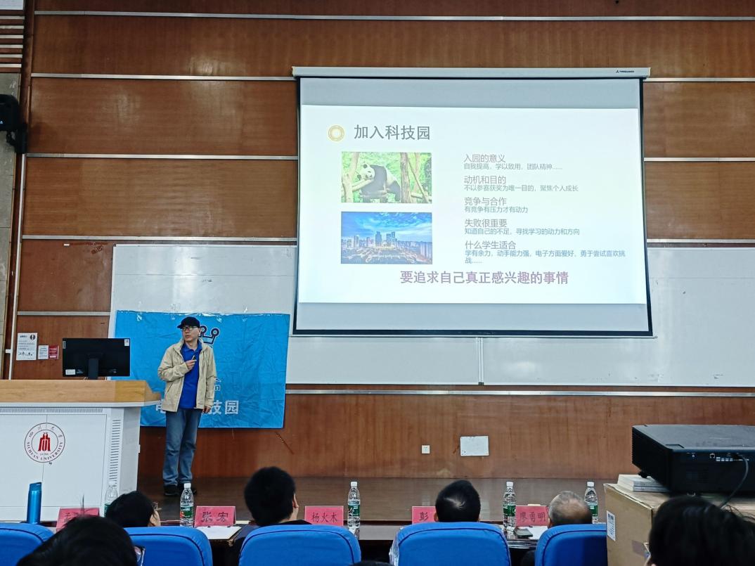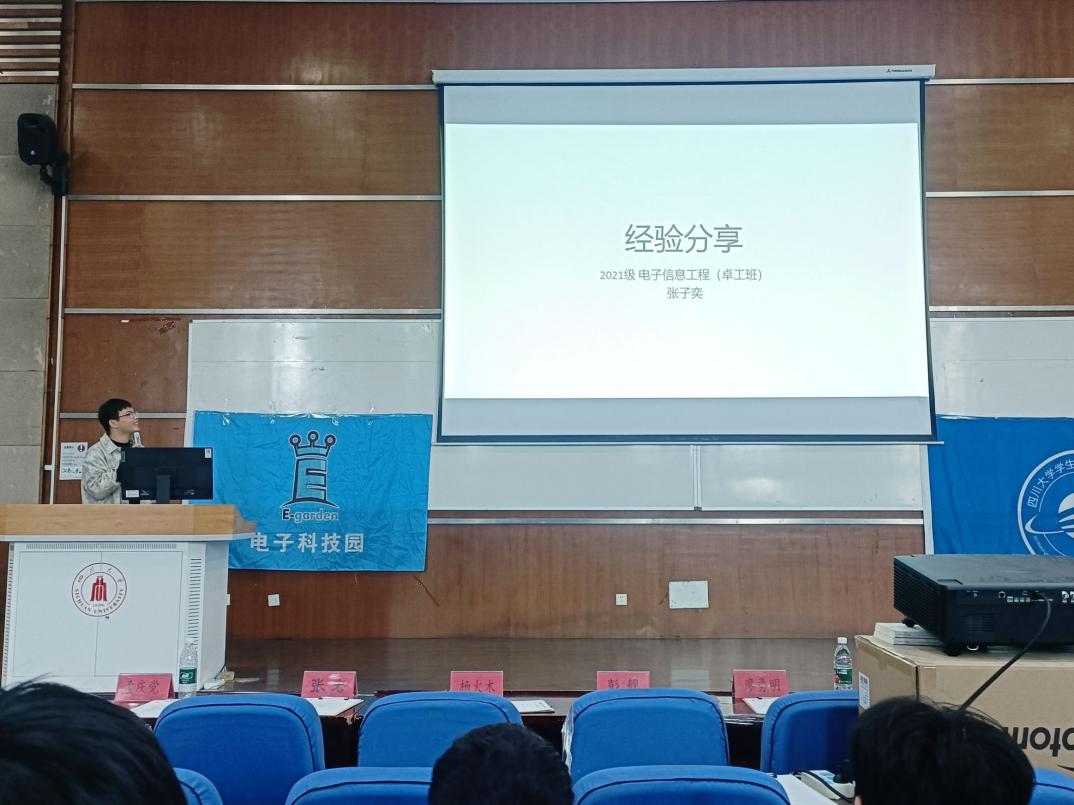 此次大会旨在为24级大一新生提供学习经验,帮助同学安排本科学习生活计划,鼓励同学们大胆创新,勇于实践。大会开始前,各领导和老师入座,主持人宣读会场纪律。大会第一项,党委彭舰书记致开幕鼓励同学大胆参加各种社团尝试科研活动培养自己的实践动手能力。大会第二项,学院老师分享孟庆党老师聚焦于个人能力的发展,介绍学习经验,侧重介绍了川大提供的学术科研平台,深入竞赛部分,提出“以学备赛以赛促学”的竞赛宗旨鼓励学生有计划有目标地参加各种竞赛活动接着吴周杰副教授分享个人科研经历,与同学们深入交流同时讲述了光电等相关专业的科研以及工作前景。大会第三项,优秀学长交流心得体会。张子奕学长生动有趣讲述自己的学习竞赛保研等经历分享个人感悟。肖迪学长则专注于电子类竞赛的分享,详细介绍各种竞赛,并对本科四年的竞赛安排进行分析,就如何合理分配时间、提高个人综合能力提供了宝贵的建议。大会第四项,问答环节。现场的同学们踊跃提问,学长们耐心细致地解答了同学们关于学习方法、竞赛规划、科研经验等方面的疑问不仅帮助同学们澄清了疑虑,也让他们更加明确了自己未来在大学期间的努力方向。至此,电子科技园2024会员大会暨信息科学技术分享会圆满结束。